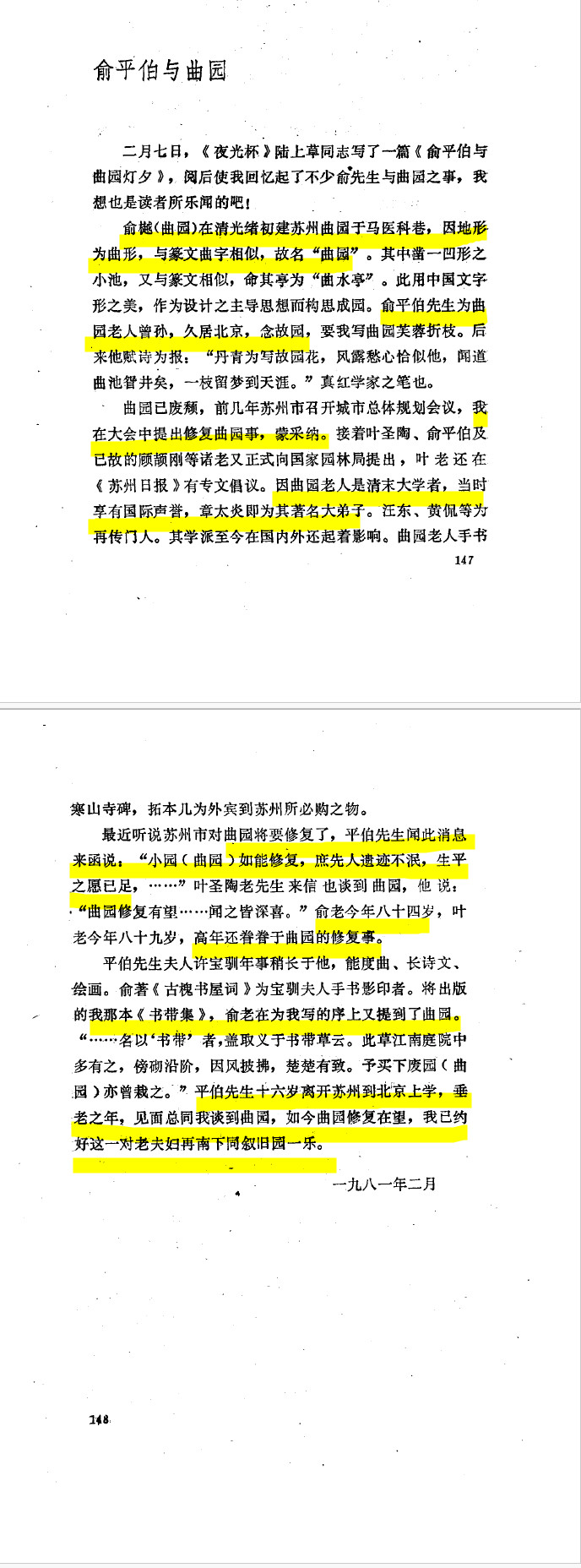 俞平伯与陈从周有着深厚的情谊,他们都挚爱昆曲、园林、文学诗词等,有着共同热爱的人,无需多言便能心意相通。陈从周、叶圣陶、顾颉刚等人曾上书呼吁修复曲园,闻听曲园将要修复的消息,俞先生激动地写信给陈从周,“小园(曲园)如能修复,庶先人遗迹不泯,生平之愿已足。。。。。。”,“俞老84岁高龄还眷眷于曲园的修复事”,“我那本《书带集》,俞老在为我写的序上又提到了曲园”,“平伯先生十六岁离开苏州到北京上学,垂老之年,见面总同我谈到曲园,如今曲园修复在望,我已约好这一对老夫妇再南下同叙旧园一乐。”。