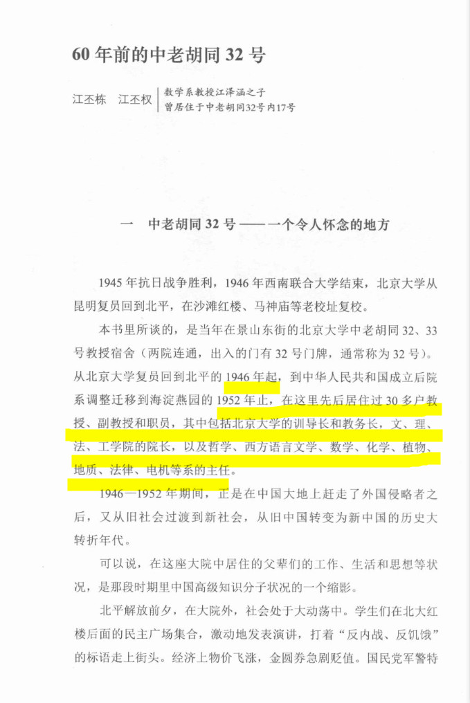 据江泽涵之子江丕栋回忆,1946年至1952年间,大院成为国立北京大学教授的校舍,这里先后入住过36位教授及其家属,包括北京大学训导长和教务长,文、理、法、工学院院长,以及哲学、西方语言文学、数学、化学、植物、地质、法律、电机等系的系主任。
