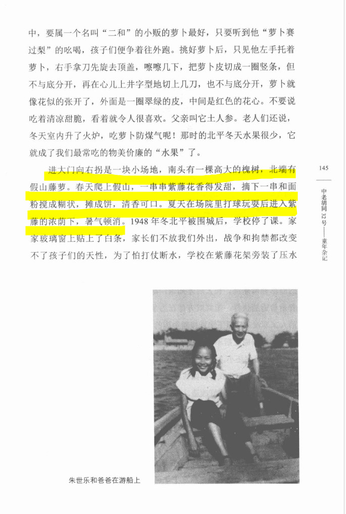 朱世嘉这样回忆童年生活:“进大门向右拐是一块小场地。南头有一棵高大的槐树,北端有假山藤萝。春天爬上假山一串串紫藤花香得发甜。摘下一串和面粉搅成糊状,摊成饼清香可口。夏天在场院里打球玩耍后进入紫藤的浓荫下,暑气顿消。冬天利用紫藤花架旁的压水机把小空场浇成冰场,穿着父母从东华门地摊上买来的旧冰鞋溜冰玩。”