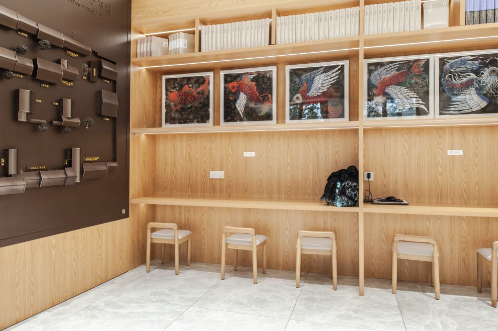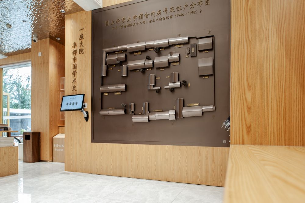 进入书社,靠右边的墙上是国立北京大学宿舍内房号及住户分布图沙盘,配以“一座大院半部中国学术史”的文字。与墙上老北大宿舍纪事配套的,是在这个院里住过的北大老教授们的著作,如朱光潜的《谈美》、《试论》、《给青年的十二封信》等,也有沈从文、胡适等人的著作。此外,还有北京中轴线系列主题图书、老北京历史风物及历史主题图书,以及北大校园同款文创。