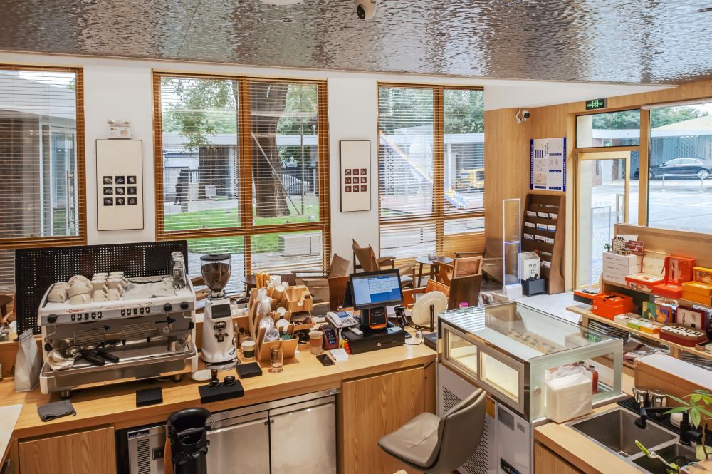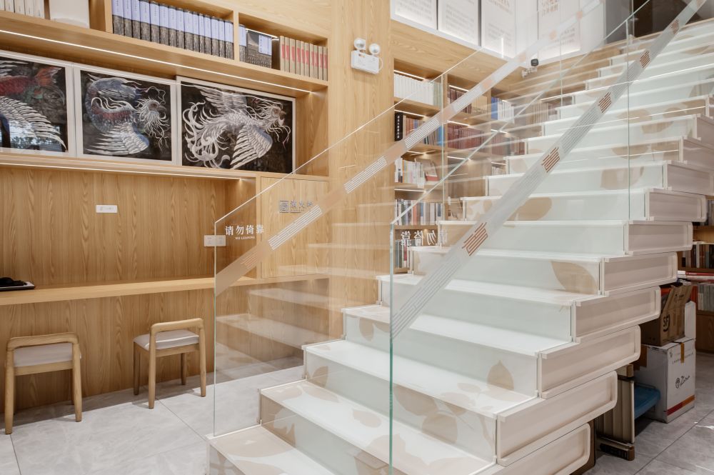 书店共两层,二楼是办公区兼会议室。一层面积不是很大,落地玻璃窗与原木色桌椅构成咖啡阅读区,吧台和咖啡阅读区占据了店内至少一半空间,书籍不是很多,园内还有其他的商业配套,如依托百年槐树打造的灯光艺术区、餐饮和剧场等等。