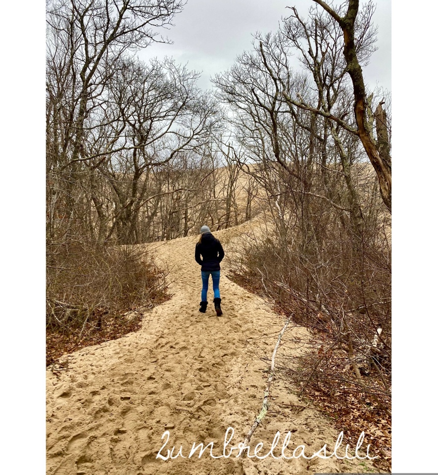 看到路边停了几辆车,知道路边应该有海滩入口,于是我们也在路边停了车,不等我穿好大衣,俩娃已经跑进了小树林子。等我小跑着进了小树林子,眼前呈现出一个小沙坡,女儿正深一脚浅一脚地弓着身子往上爬。