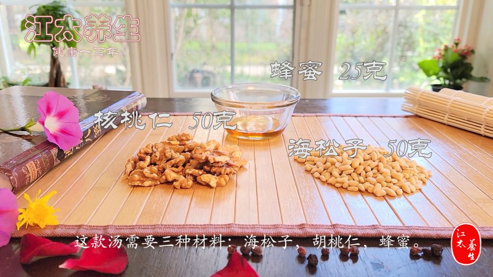 材料:松子仁,核桃仁,蜂蜜。