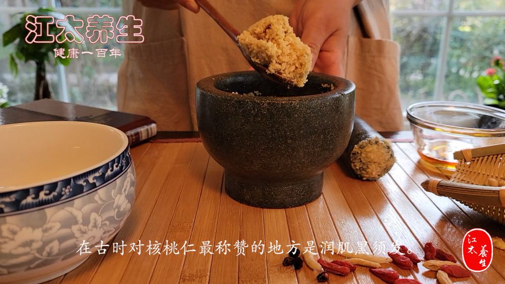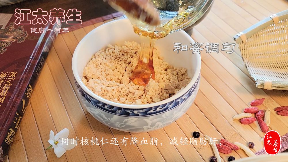 做法:滚水浸泡核桃仁4分钟去皮,上两件研烂,次入蜂蜜和匀。