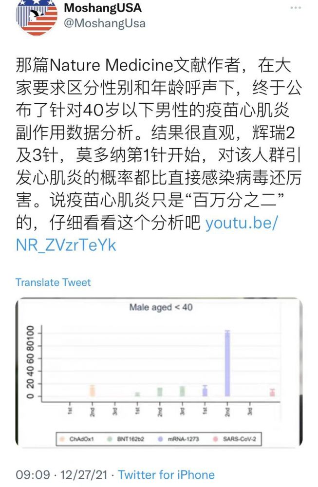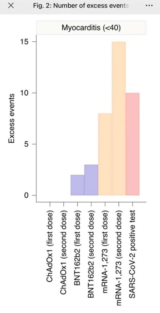 还值得一提的是,图中最后一组数据,即粉红色柱(bar)对应的是感染新冠后得心肌炎/心包炎的频率。但是考虑到很多同年龄段感染covid后轻症、无症状,并不会汇报,所以这部分数据其实比实际的还要高估了若干倍。再考虑到,即使没有接种疫苗,也不是人人都会感染,如果加一组不打疫苗的40以下男性心肌炎的数据,这个风险还要更低。