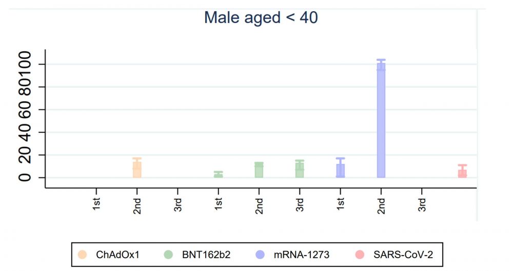 果然,在区分了性别之后,40以下男性面临接种疫苗之后心肌炎的风险,就比此前男女混合时候做的分析,对比更加清晰。
