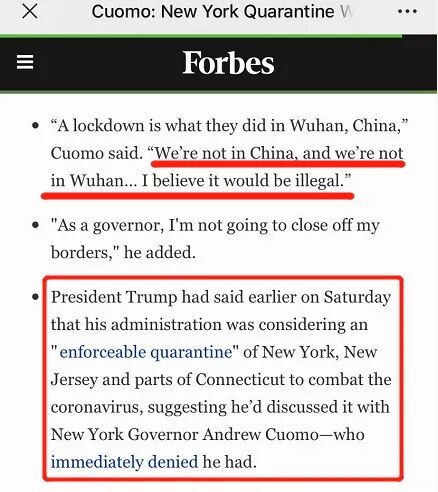 美国宪法《第十修正案》规定了,美国各州拥有相对独立的自主权。20年3月美国政府考虑对纽约州、新泽西州和康纳狄格州施行强制隔离,纽约州长库莫(Cuomo)回应这是“联邦要向地方宣战”,“...不同于武汉,我觉得封城在美国是违法的”。(福布斯报道)