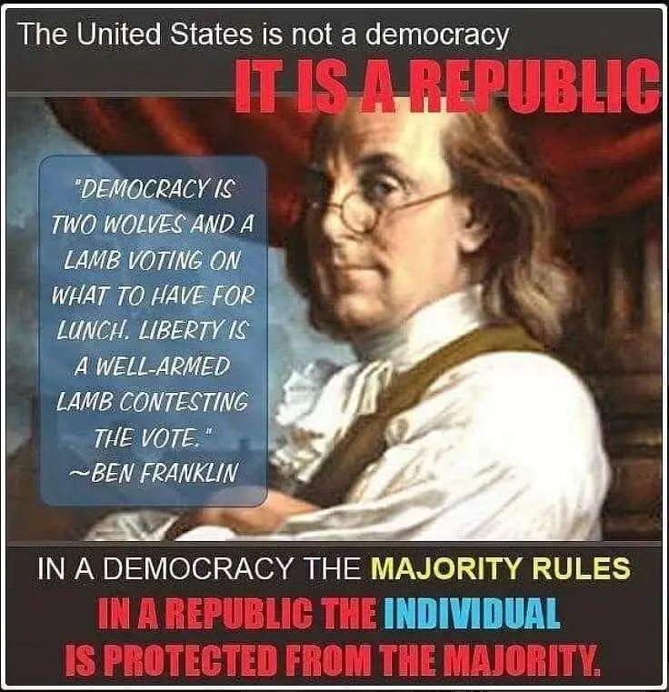 建国先贤本杰明·富兰克林(Ben Franklin)曾经总结共和制和直接民主的差别在于,防止群体暴政,多数人的意志不能凌驾于个体独立之上,避免民主制度中“少数遵从多数”制度的这一个本质上的缺点。