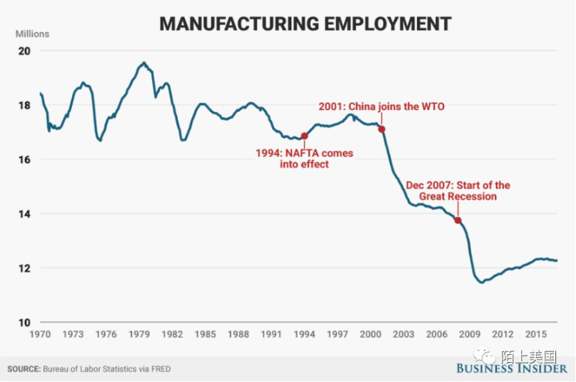 这些文章都没有提到另外一个背景,甚至可能是更重要的根源,那就是经济因素。南北战争让南方奴隶制寿终正寝以后,被解放了的黑人开始往北迁移几十年,芝加哥、底特律和纽约这些北方大城市的非裔多了起来,很多在肉类加工、钢铁或汽车行业找了工作(点击前文)。尽管美国在第二次世界大战中确立了“世界工厂”的地位,但是伴随着70年代启动的去工业化进程,这些部门衰退,男劳动力开始面临失业。虽然60年代末期,民权运动取得成效,促使美国政府推出各种弥补政策应对种族歧视,但是黑人的经济和社会地位还没来得及获得全面的稳固改善,就陷入了这轮渐进的冲击。