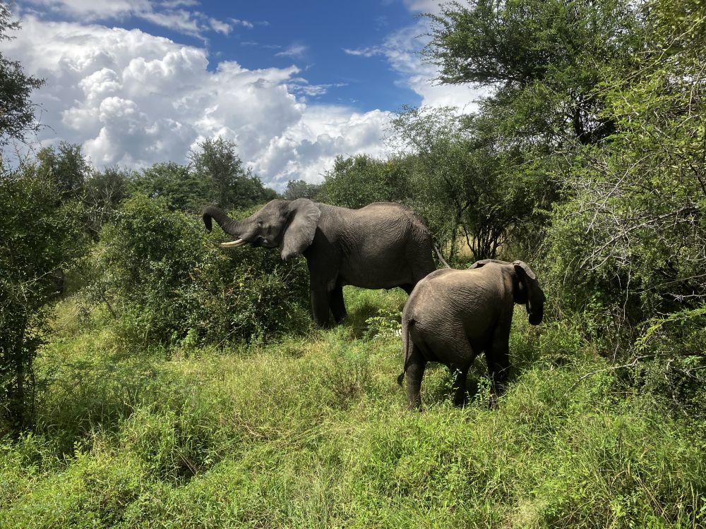 目标是找到大象和豹子! 找来找去,大象看到好几群,可豹子无处可寻!离得最近的一次,是遇上一辆对过的车,他们说他们来路不远处,离公路约一公里处的一棵树上,有一个豹子可用十倍望远镜看到!我们去试了一下,同车的人,最接近的是,有人说用手机放大镜,看到了一个黄点!