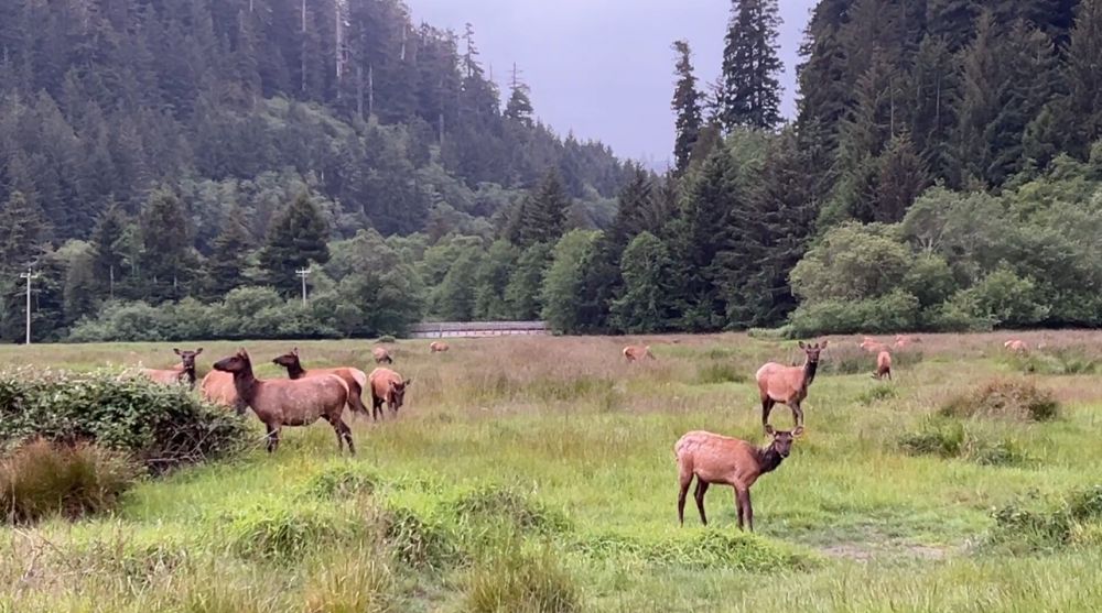天色已晚,是动物出来活动的时候。 这一天在路上两次遇见黑熊,真是很幸运的事情。 回驻地的路上在Elk草甸停下来,正有一群Elk在这里活动。 红树林中的这群Roosevelt Elk 是以罗斯福总统的名字命名的一种Elk。 罗斯福总统在推行保护自然资源中所做的工作,让后人享受到树荫下的凉爽。