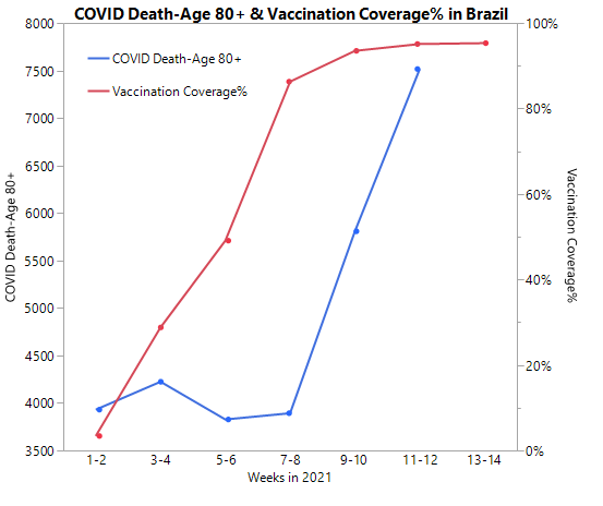 巴西80岁以上的老人三月初90%以上的接种疫苗,一个月后死亡人数翻倍,二者的时间相关性充分说明了新冠疫苗不仅不能降低新冠死亡,反而会因为ADE加重死亡[51]。