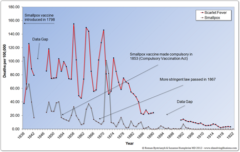 由于这些危险的生活条件,瘟疫和传染病司空见惯。早期进步人士认为,通过公共卫生计划改善致命的生活条件和减少资本主义对工人阶级的剥削(比如给予休息时间或不强迫 5 岁的儿童整天从事繁重的劳动)是解决问题的关键。随着公众被天花疫苗愚弄折磨并奋起反抗,加入抗议行列,进步人士最终赢得了胜利,通过改善卫生解决了这些致命疾病。 当时最流行的致命疾病是猩红热,它杀死的人比天花多得多,在没有疫苗的情况下,它随着公共卫生的改善而快速下降,它的下降和天花的下降同步。今天的人们很少有人知道猩红热以前是远比天花可怕的瘟疫。