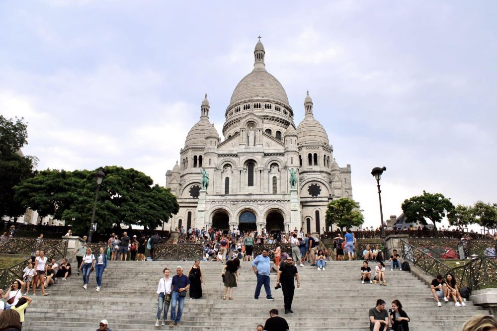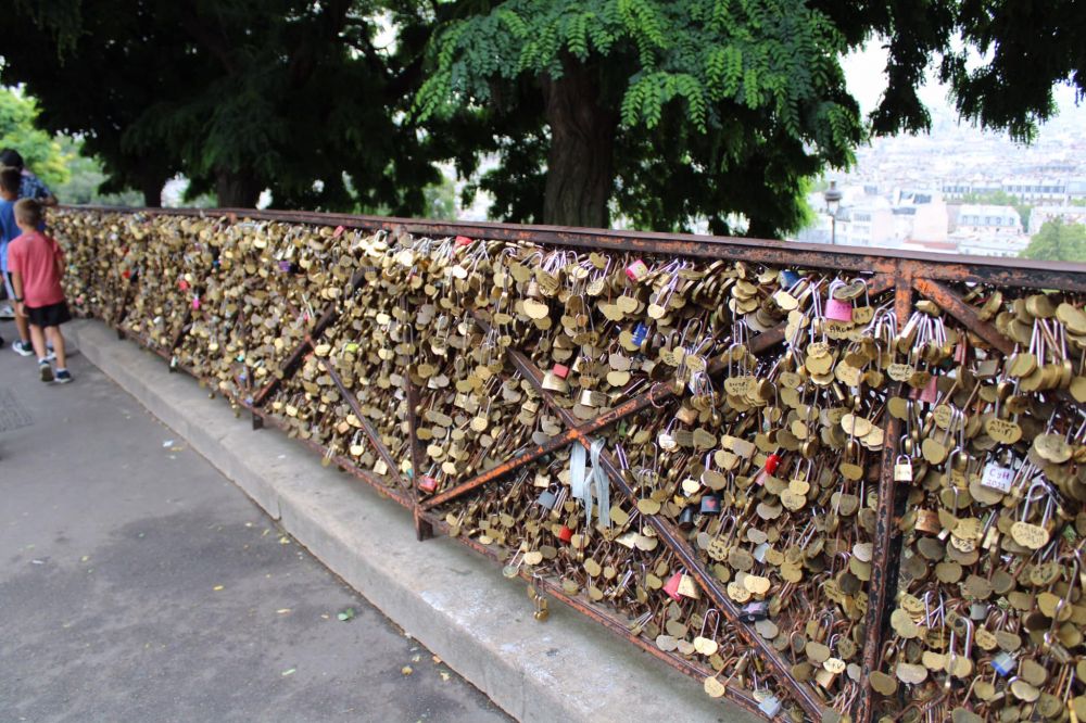 一到圣心大教堂前面,竟看到有地摊在卖锁(忘了拍照)。正纳闷时,看到周围铁拦,有的挂满了锁,有的也正在挂满。原来有不少的游人要在此买锁锁锁,把心锁在大教堂前,示与圣心同在。但从卖锁的角度来看,如果能有万能匙,不是可一本万利,节约锁源吗?