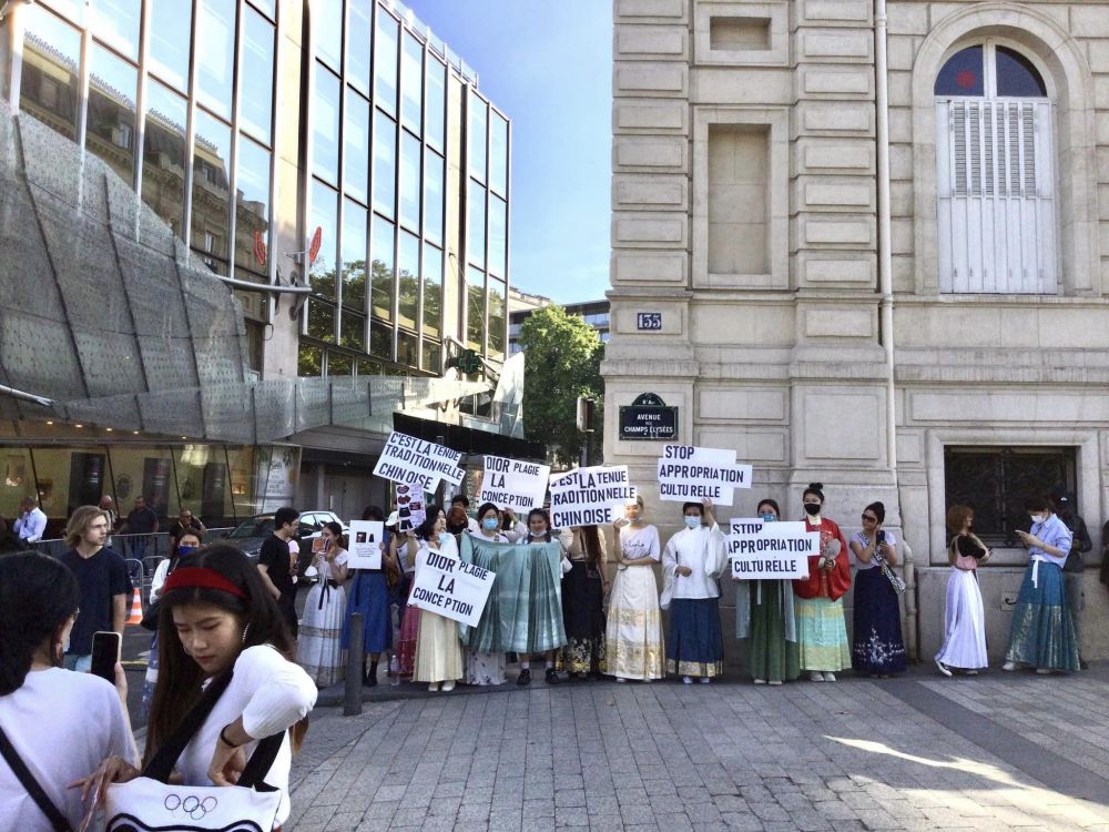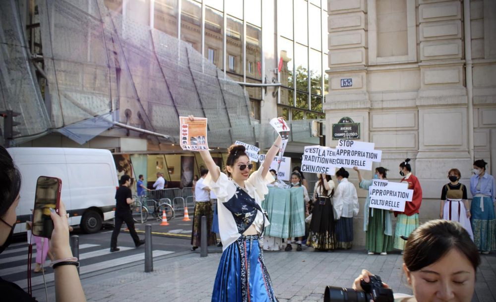 当天是22年7月23日,夕阳西下时分。在香榭丽舍大道上,碰巧遇到一组中国年青人,主要是女性,站在街边,举着标语,交替地用中文和英文喊着口号,要求名牌公司DIOR停止文化挪用。驻足观看了一阵。旁边的一个年青人向我展示了一个图片,说D公司的一套新款服装挪用了汉服的模样。她们是在巴黎抗议D公司的文化挪用,却只用中英文喊口号。看来她们希望的受众是懂英文的,或者中文,而不是直接的法国人了。