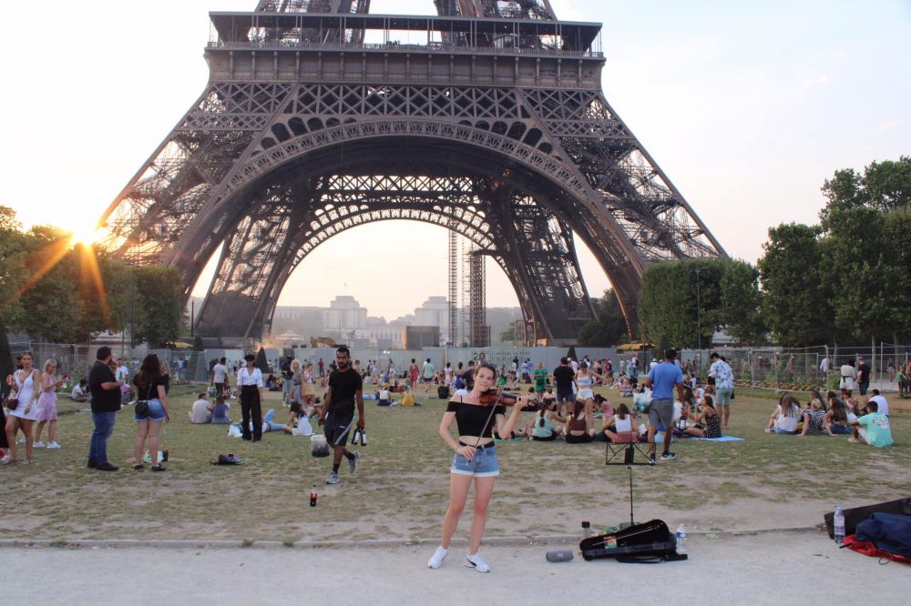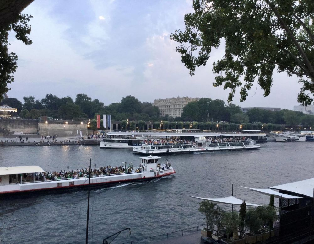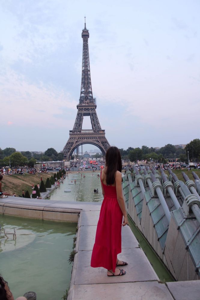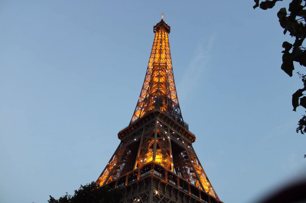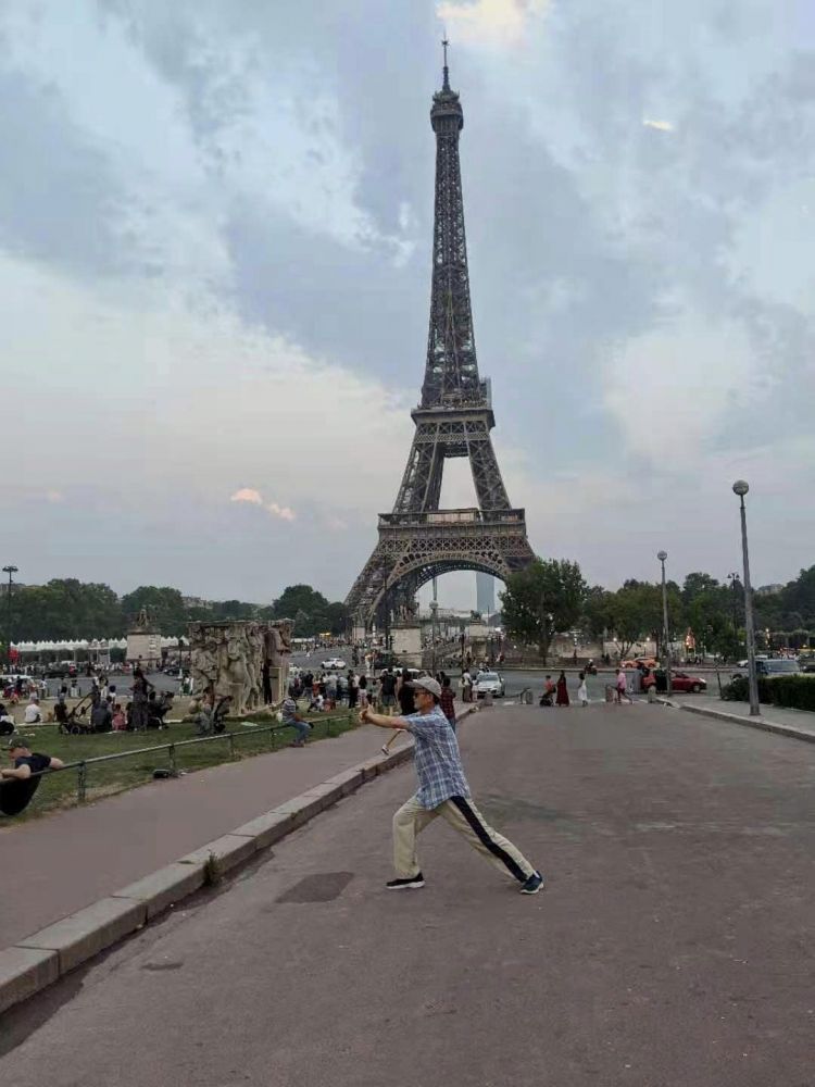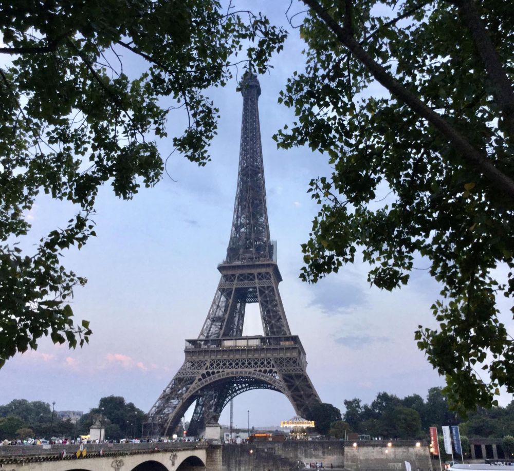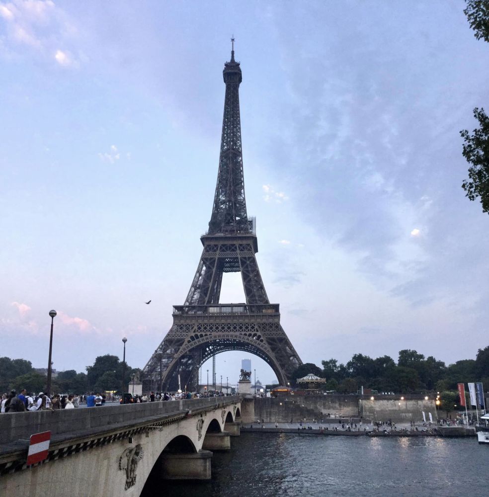 本来计划7月19日,第二天一早就先去埃菲尔铁塔。没想到一觉醒来,巴黎居然热到了罕见的42摄氏度,无法出门。下午顶着酷热出去找歺馆,还好不远处就有中歺馆。门关着,上写晚六点再开。一打听,巴黎的歺馆都是下午两点半关门到六点,每天如此,好感意外。只好等到六点过才吃了一顿中餐。傍晚,酷热稍降,再乘公交去埃菲尔铁塔。车上居然无空调,热得只能喘着气到铁塔地。此时天已黄昏。