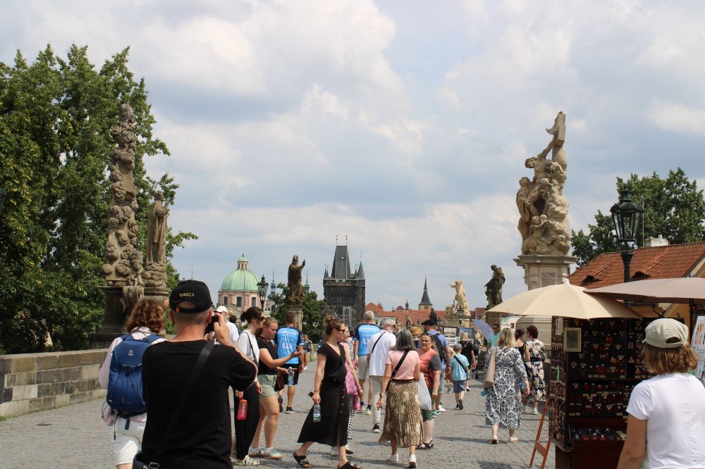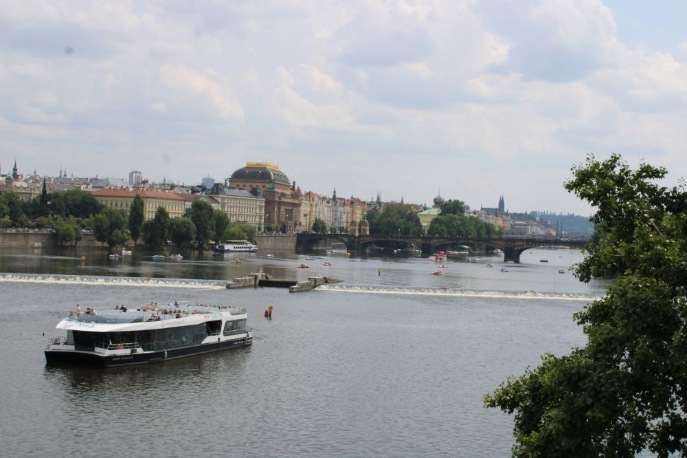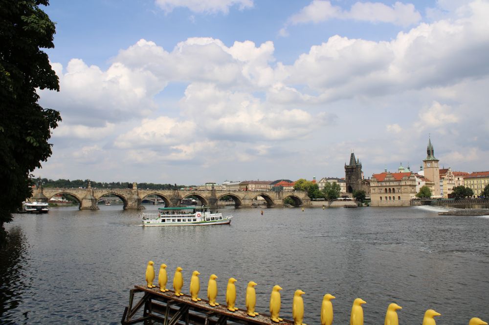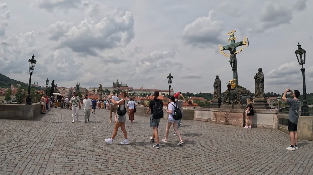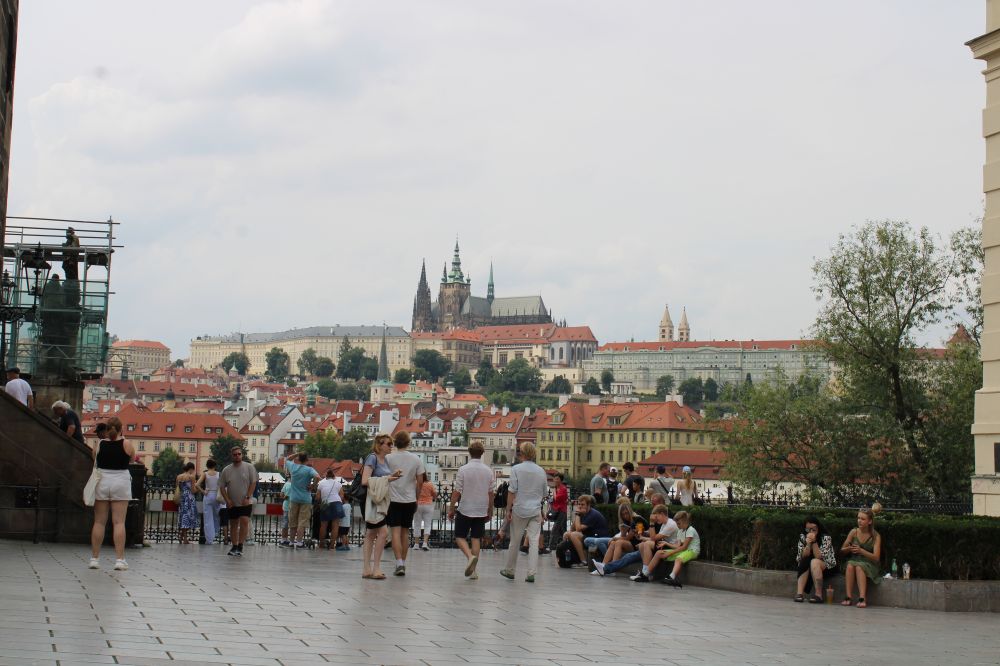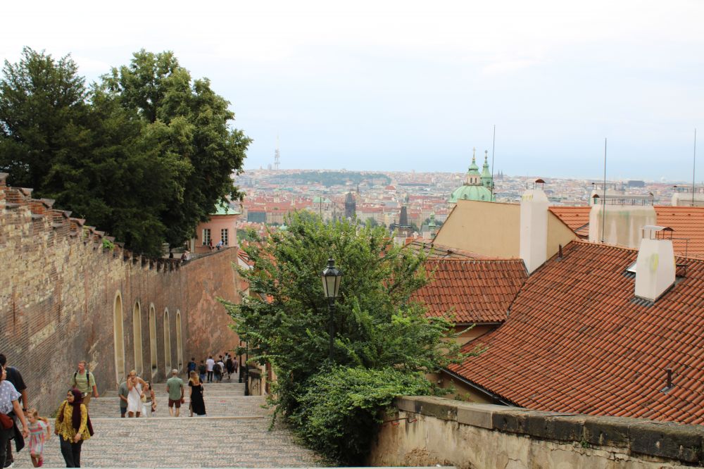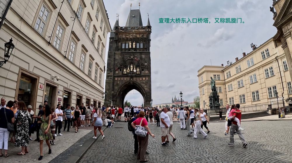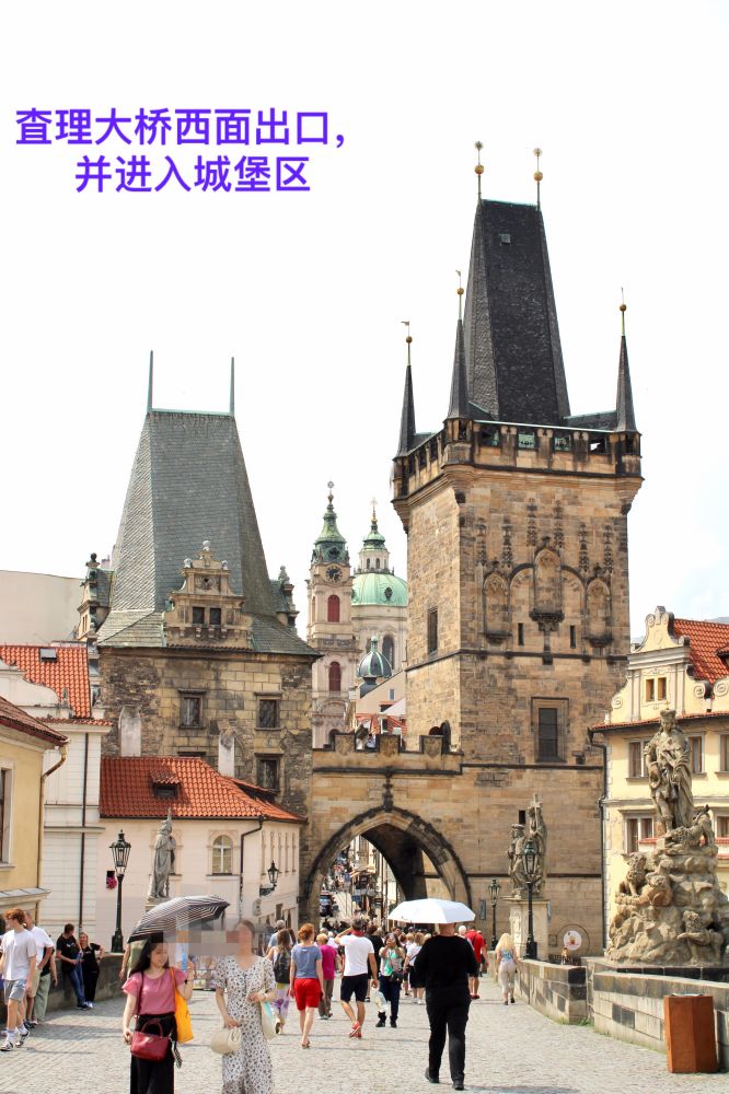 7月12日下午的温度高达三十度以上,行走在外,非常炎热,但广场上仍然是川流不息的人潮;街巷里,人肩相擦,特别是在查理大桥上。可见布拉格老市区的热闹程度。我们热了,累了,来到河西岸桥下公园小息片刻。这时突然来了一场雷阵雨,好一个及时雨。倾刻间,凉风吹散了身上的疲劳,天上乌云也遮盖了太阳。雨后,剩着凉风带来的轻松感,又继续朝桥西丘陵高处的历史城堡前行。