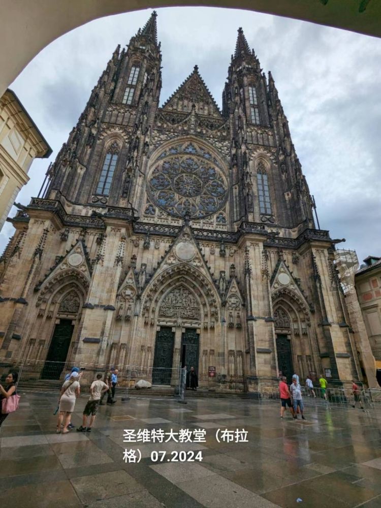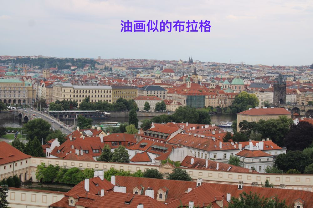 沿着缓缓的石梯登上了山顶上的圣维特大教堂所在地。这时回头眺望,居高临下,神奇,古老,美丽的布拉格,像一幅无任何笔墨修饰的大型天然油画,展现在眼前。红瓦,绿树,桥梁,河流,游船,还有远,近不同的教堂尖塔建筑,等等,构成了这幅天然油画的艺术元素。此时此刻不禁感叹,布拉格的老城区,无与伦比的旅游胜地,人类不可多得的瑰宝之地。