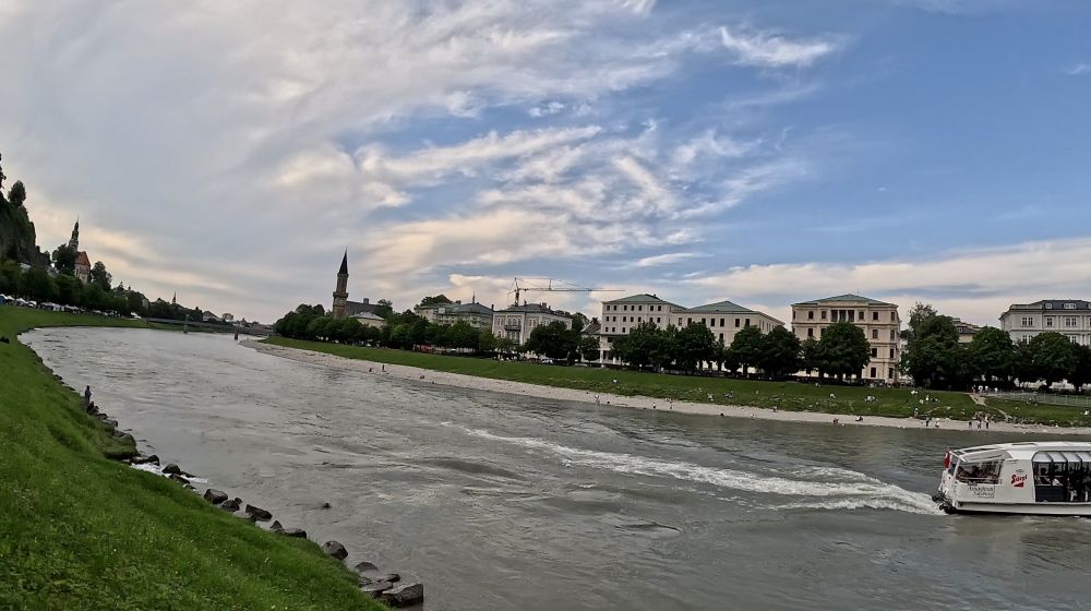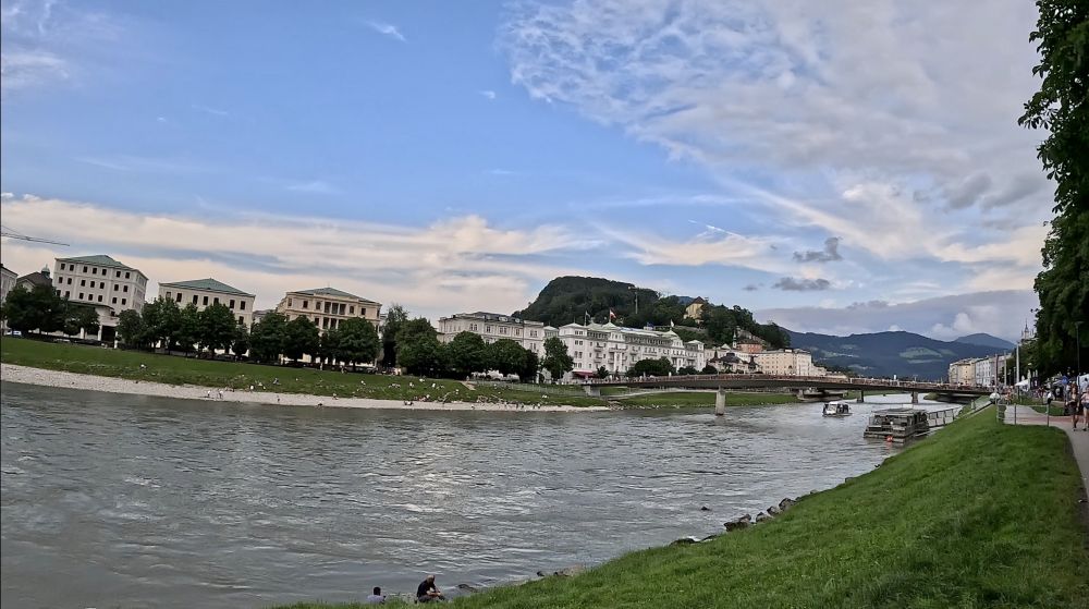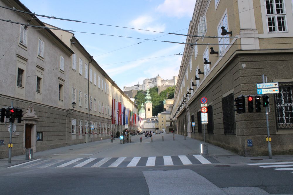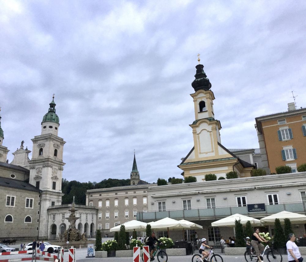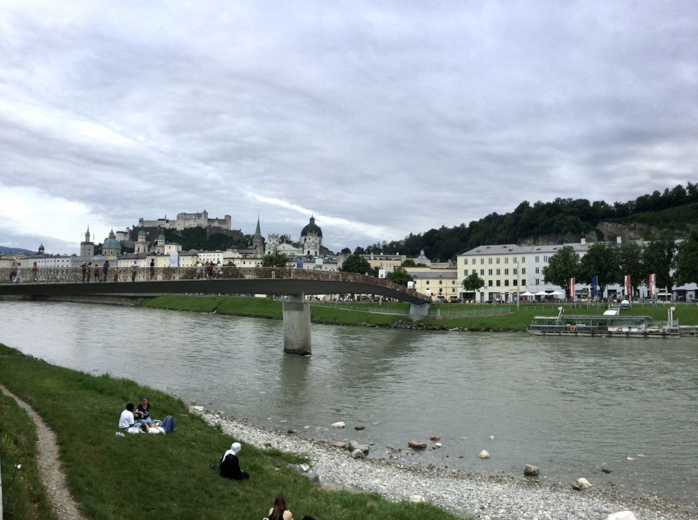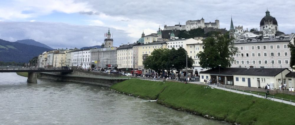 萨市不大,人口也不多,大概15万多,却很有名,因为萨尔茨堡是音乐天才莫扎特的出生地。莫扎特不到36年的短暂生命中超过一半的岁月是在萨尔茨堡度过的。萨市也是指挥家赫伯特·冯·卡拉扬的故乡,电影《音乐之声》的拍摄地。萨尔茨堡老城在1996年被联合国科教文组织列入世界文化遗产名单。美丽的萨尔茨河把萨尔斯堡分成新城、旧城两部分。因为只有半天时间,我们主要走游了老城区。
