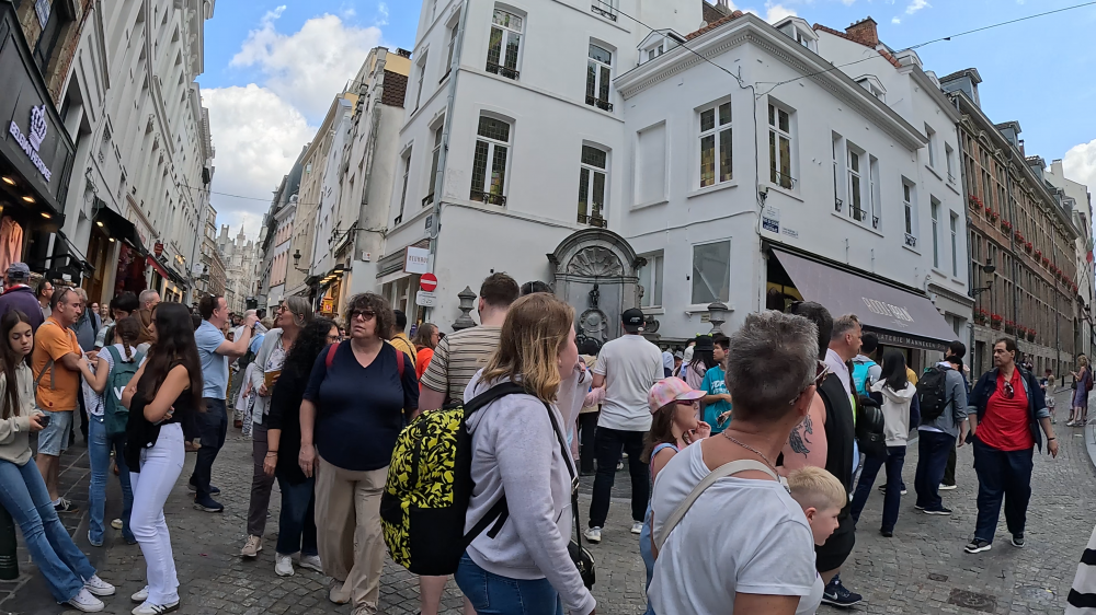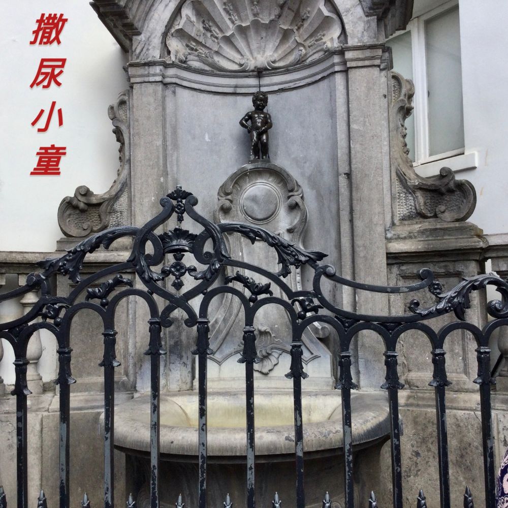 跟着人流走,很快来到市政厅所在地布魯塞爾大广场,观游了一阵。又随人流走进了一个长长的小巷里,有很多巧克力商店,原来这里盛产巧克力。还路过了一家巧克力博物馆。小巷的前面路口,游人流动减慢,好像驻足在看什么。走近一看,原来是小于连铜像,所谓的撒尿小童。传说四百年前,西班牙占领者在撤离布鲁塞尔时,打算用炸药炸毁该城。幸亏小男孩夜出撒尿浇灭了導火线,拯救了全城。为了纪念这个撒尿小英雄,特制作了这尊不间断地尿尿的小童塑像。