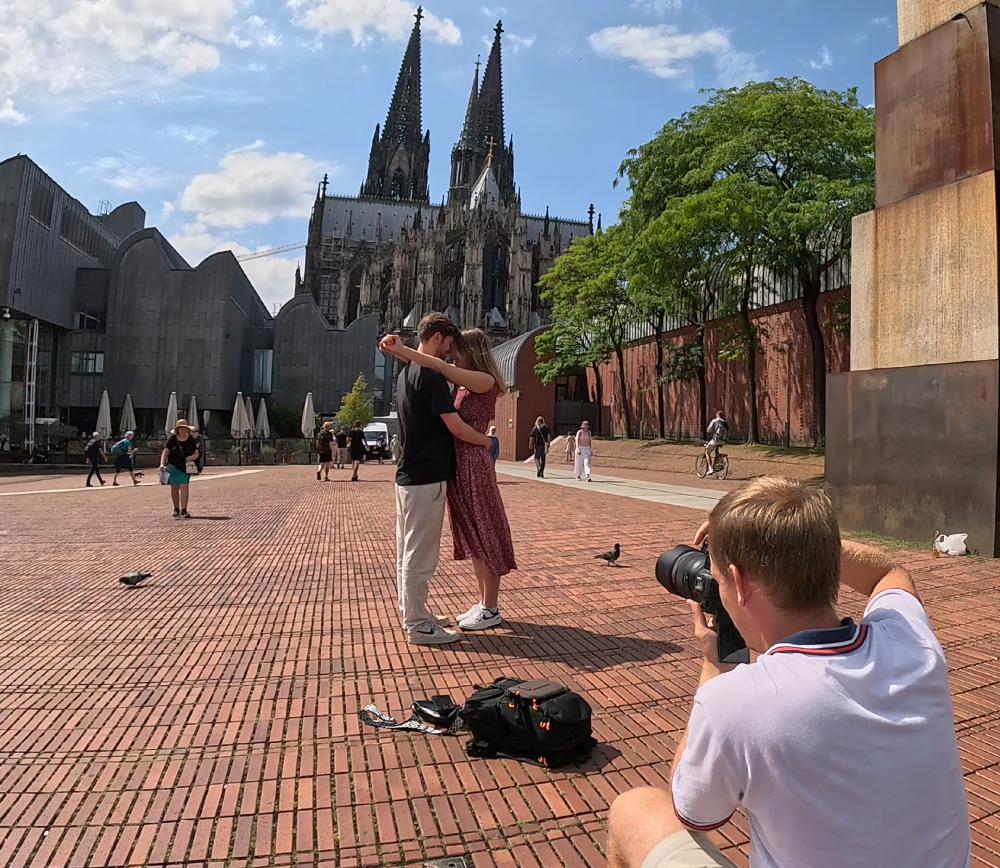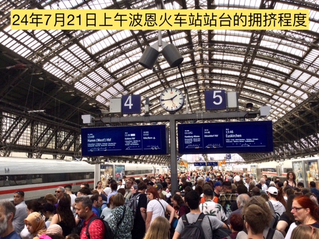 2024年7月21日,星期天。从波恩去科隆,没有预定火车票,因为只有半小时的路程,应该火车班次很多,可机动灵活出发。去火车站的路上,几乎无人,通勤车里也只几人而已。但到了波恩火车站,站台上却挤满了乘客,并多数在等去科隆的车,是什么情况?当时无头绪。车来了,果然很多人拥进这辆去科隆方向的车。当我们挤进去时,已只能人挨人站在门口的空地里,非常不舒服。这时意外发生了,火车广播说科隆方有人占据了铁轨,火车无法驶离波恩站。不多久,乘客中有人不耐烦了,下了车。这样耗了十几分钟,居然有些有座位的人也下车了。真是便利了我们,居然幸运地还坐上了座位。刚坐下一会儿,车方就说占据铁轨的人已清场了,于是火车很快就启动离站。