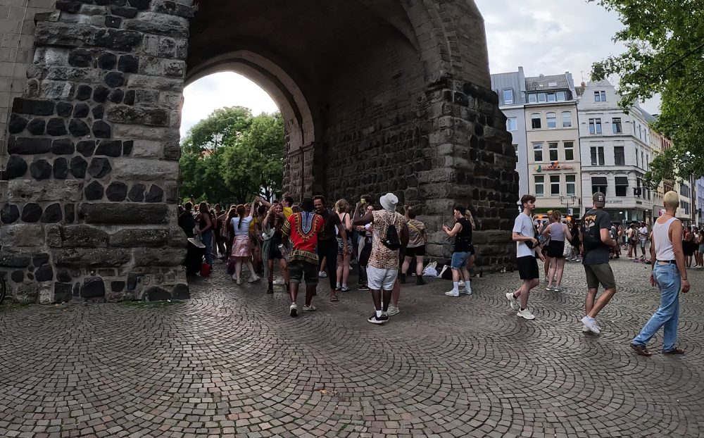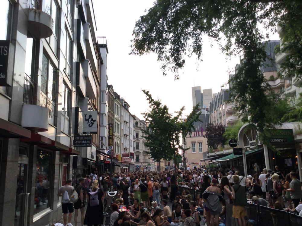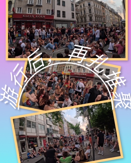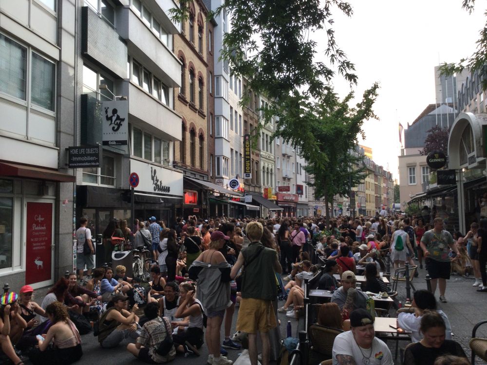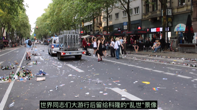 原来科隆当天有世界同性恋大同盟游街活动(波恩那么多的乘客应该就是冲着这个活动来的吧), 几条闹街上,“同志们”近似疯狂的喧嚣,直到傍晚。游街结束后,几条街里都是被弃的空洒瓶,随意扔掉的弃物。好似一场狂欢节散场后的景象,一片狼藉。在一个不大的广场里 ,还有几十上百的年轻人随着音乐纽纽捏捏地跳舞。那种开心自在的气 氛,似乎刚过了狂欢节而余兴尚存一样。