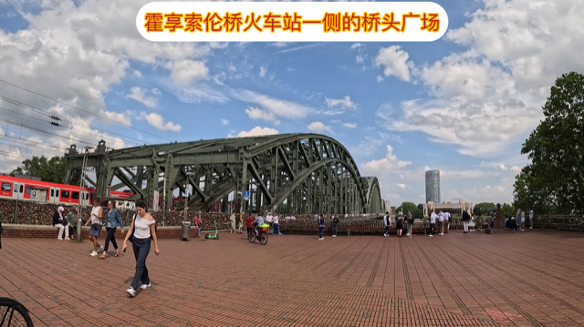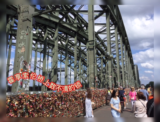 在大教堂附近,并与火车总站相连的霍享索伦桥,是另一个科隆景观区,游人很多。尽管该桥主要是铁轨桥,但桥两侧是行人道,所以可步行至河的对岸。印象最深的是,与巴黎的蒙马特高地一样,在桥的铁栅栏上锁满了锁。有些区段,挂了两,三层, 而且很多锁已锈透了整个外观。可见这里锁锁的历史有多久,应该比蒙马特高地的锁历史更长,规模更大。规模大到当局都担心锁的总重量会影响到桥的结构,正计划要去锁化,并永不允再锁桥栏。