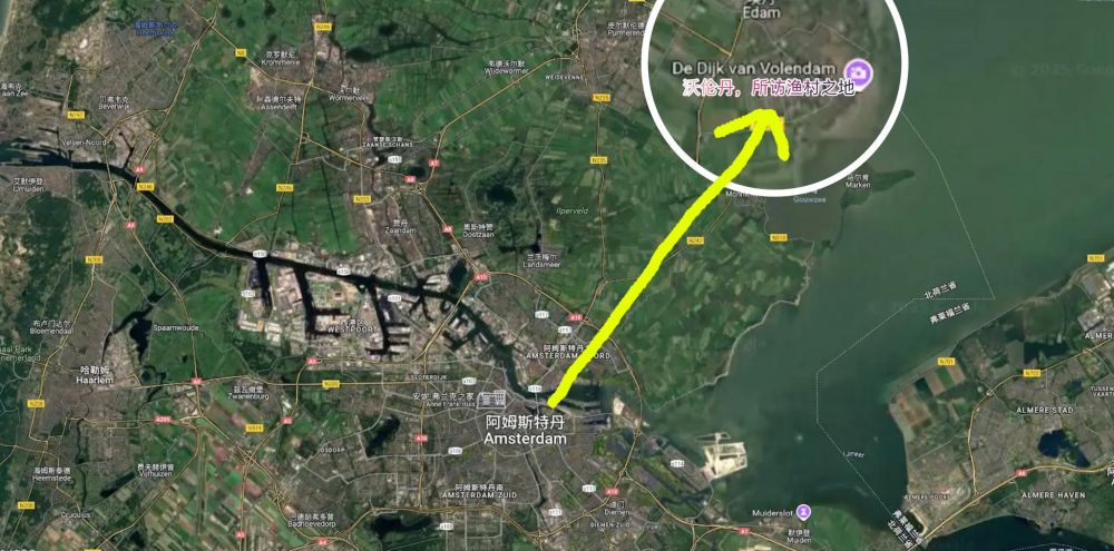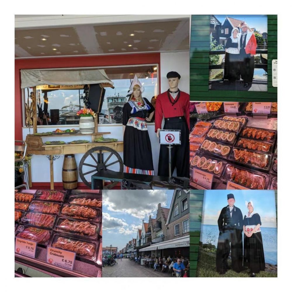 2024年7月27日, 从阿城机场坐两趟火车,再转坐一趟汽车,才到达该渔村。其实沿岸有好几个小渔村,但最有名的就是沃伦丹Volendam,又是以dam结尾的地名。原来荷兰有很多丹結尾的地名,像是沃伦丹、阿姆斯特丹、贊丹、艾丹和鹿特丹。这些丹(Dam)指的就是”水霸”,荷兰每年都得处理不少的水的問題,所以修建了很多很多的水壩。