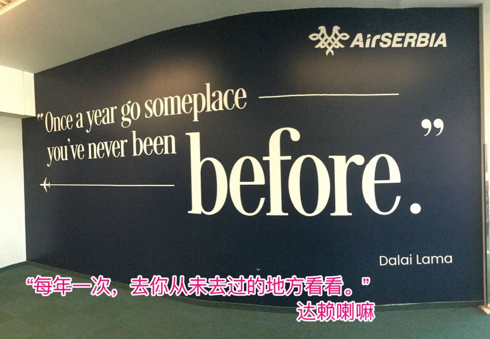 进入候机大厅,却没有现代国家通常都提供的免费饮水系统,也没有供游客充电的插座。好一个塞尔维亚,竟如此与世界潮流脱轨。但墙上看到这么一句话“Once a year, go someplace you have never been before—Dalai Lama”倒是有些激励与启发。我们似乎正在践行他的话。