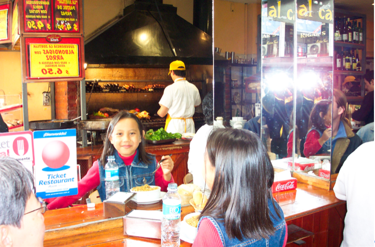 吃 旅游书上说,阿根廷是吃肉的国家,以牛肉为主食,午餐和晚餐都可以吃牛排。梦华早就磨牙擦爪,准备大饱口福。第一次吃牛排是在一家快餐店,已过了午餐时间,大部分东西都收起来了,只有两片牛排还放在外,我们只要一份牛排。服务员专门来问是要一份、还是三份,我说一份,结果他端上来两大片牛排和一盘面包,足够我们三人吃。牛排是粘了面包粉在油里炸的,3个Peso,合1美元。我们分析是他们多给我们了,把中午剩下的都给我们了。第二次去另一家餐馆,要的是带骨头在火上烤的那种牛肉,一份也够三个人吃了。只见旁边一桌三位七十岁左右的老太太,每人都要了一份炸牛排,大小和我们三人吃的差不多,外加炸土豆条,消化能力够强的。书上说他们还吃牛肚、肠、血等下水。梦华学了这些菜西班牙文的名字,然后挨家挨户地看餐馆的菜单,有这几种菜的才进去。端上来的是个大铁盘,上面滋滋冒烟地烤着牛肉、肠、肚,牛血肠丫丫最爱吃,加上两个生菜沙拉,一瓶葡萄酒,17个Peso(合6美元)。超市的牛肉更便宜,比美国的便宜三分之二。首都的街上几步远就是一个烤肉炉,就象美国纽约卖热狗的一样,他们烤的是大块的牛肉,你去买他给你切两片夹在面包中,加点佐料,不到一美元。当地的出租车司机学生都是这样吃的。