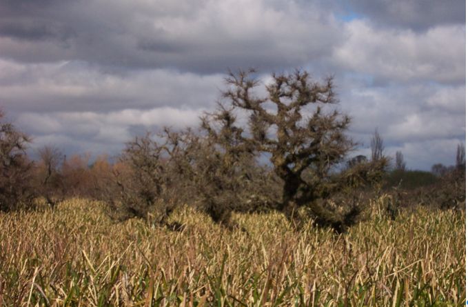 第四天我们深入阿根廷腹地。阿根廷的文化是牛仔文化,欧洲人来,发现了大片的平原,水丰土沃,于是运来了牛和马,养牛和马只要有地有草就行了。我们一路几百公里的开出去,一码平川,没有什么山坡,遍地是草,连树都很少,若有树就是有人家了。树都是人种的,象桉叶树、松树都是从欧洲进口的,很少见本地土生土长的树。本地土生土长的树我们拍了照,样子象梵高晚年画的树,没有躯干,很矮不成材。偶尔路边见一人骑着马,头戴草帽,那就是牛仔了。用不着几个牛仔就可以管理成群的牛马和土地。