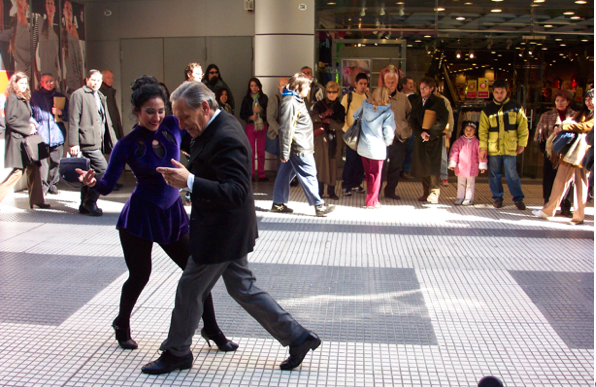 人说阿根廷有两首国歌,一个是正式场合的,还有一个是探戈(Tango),这是国粹。那么多姿多彩、富丽华美的探戈音乐和舞蹈实际上起源于贫民。十九世纪末,阿根廷、乌拉圭等南美洲国家纷纷独立,结束了长达50年的国内战争,大批欧洲移民涌入,很多老兵退役,所以在布宜诺斯艾利斯这个港口城市聚集了大批移民,而且以男性居多。各个民族有自己的音乐传统,探戈混合了非洲来的节奏,意大利南部的韵律和当地牛仔的心声,产生在妓院里,开始是不为上层社会所接受的。使它传播开来的是牛肉,冷冻工业发展起来后,阿根廷的牛肉得以出口欧洲,使阿根廷迅速富裕起来。受欧洲咖啡馆文化的影响,探戈音乐进入了高级娱乐场所。到阿根廷来探戈是不可遗漏的,一到旅馆,服务员就介绍各种著名的探戈表演,有车接送,有吃有喝,150美元一个人。我们自己有车,没有上他们的圈套,利用一个下午,开车到市区的探戈表演区。这是一个星期天,正赶上市区的跳蚤市场。整个区是步行的,挤满了各种各样的小摊,从绘画到手饰、吃的、穿的、无所不有,目不暇给。