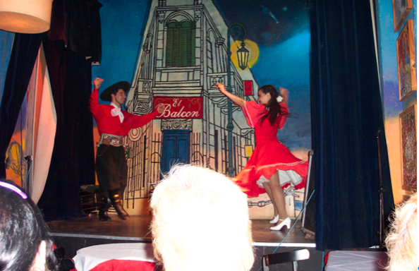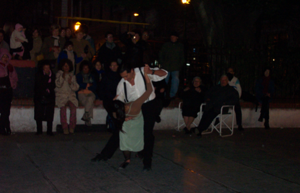 街边都是探戈俱乐部。我们走进一家楼上,见在座的都是老头老太当地人,比较放心,就夹巴螺丝地坐到他们中间,二十张桌子座无虚席。前面是个10平米大小的舞台,先是两个伴奏的老头,一个拉手风琴,一个弹吉它,一男一女各自上台唱了几首歌,我们听不懂,但都是探戈的调。与此同时,又给我们端上来一大铁盘的肉和面包,现在我们知道要保护自己的消化系统,不再全部消灭盘子上的食物了。然后上来一个穿西装的男的和一个穿超短裙的女的,他们跳了几段探戈。丫丫注意到女孩的手总是下意识地拉短裙,要不然屁股就露出来了。最后上来一对穿民族服装的男女,跳西班牙舞,很有代表性的表演,这场两个多小时的精神和粮食的会餐,合计不到50Peso,合16美元,很过瘾,特别是那两位老人的伴奏,没有电子音乐的喧闹,很专业地道。七点钟散场后,街上的地摊已经没有了,但街上的探戈才开始,围着一圈一圈的人看。我们因为有车停在外边不敢久留,多数俱乐部也是晚上8点才开张。