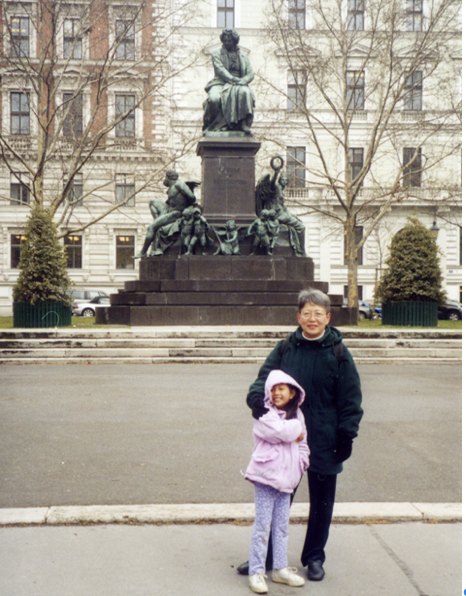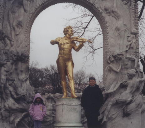 下午,与表妹俞萍和她的女儿倩倩会面,我们想看看莫扎特纪念像、歌剧院、和多瑙河。她领我们从住处步行十分钟就到了莫扎特的纪念像了。其实莫扎特是德国人,而希特勒是奥地利人。希特勒在维也纳还进了一所艺术学校,没有混出来,去了德国,希特勒的画还很有点抽象派的风格。莫扎特在维也纳出了名,现在被视为国宝,没有人在乎他是从哪来的。而德国至今仍然背着希特勒的黑锅。