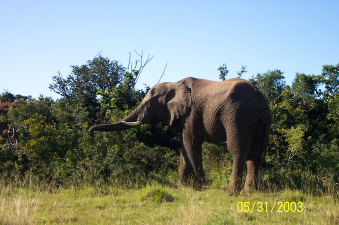 进去车开了不远,就看见了野猪、鹿、和鸵鸟。鹿的种类非常多,进门时发你一张图,你可以照图索鹿,妈妈送的那个望远镜可是派了用场。远远地看见一只大象,站在山坡上扇着两只大耳朵,我们觉得大象一般都是成群结队的,等一会儿没准会来一群象,但等了半天还是这一只孤独者。我们继续往前走,前面停了两辆车,我们马上开上去,只见路边两只大象正在吃杂树,看样子是一公一母,离我们车子只有五米远的距离。看到这两只大象我们已经很满意了,因为人家说过有时会一只都看不到。路边的杂树很高,象若不走到路边来,我们不会看见。正高兴着,前面来到一个山坡上,远远地看见对面山坡上走着一群大象,有二、三十只,大大小小,其中还加杂着鸵鸟、鹿等其他动物,这片山坡没有树,一片绿草地,灿烂的阳光照着,大象悠闲自得地吃草,真是动物的天堂。我们坐在车窗上照相,但太远,几乎照不到什么东西来。现在才知道那种大炮筒似的照相机镜头的用处,如果用那家伙把这景致拍下来,一定能卖钱。这是我们这辈子看到的最美的景象,离开以后,每每想到这幅风景,都会叹为观止:哎呀,真是太美了!公园的制高点可以下车,那群大象还在散步,但只能用望远镜才能看到。