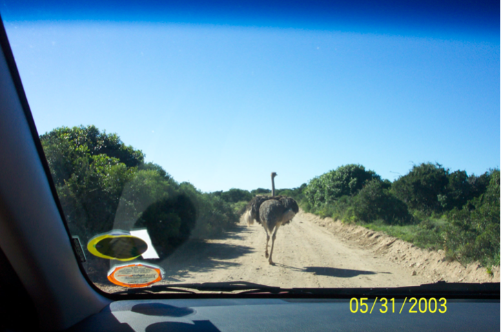 又一次看见路边有车停着,我们赶紧凑热闹停过去,结果工作人员走过来说,刚才一只大象和野牛打架,大象被野牛打死了。他们正在现场调查,让我们离开,因为象和野牛在周围,会有危险。看看路边的情景,的确是遭了灾的样子,树枝、树叶被踏倒折断满地。大象这种庞然大物连野牛都打不过,没有自卫能力。出去时我们对鸵鸟已经失去了兴趣,它们在路边探头探脑见得太多了。但一只鸵鸟显然猜到了我们的想法,干脆就挡在路中间,使我们不得不把它拍下来。这个公园还有斑马和野牛我们没有看到,留到以后到别的地方再看吧。