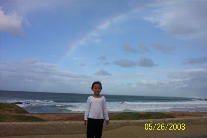 门前的美景已经美不胜收了。但第三天,阿科曼开车带梦华沿着海岸线往南走,直到非洲南端与好望角相对称的东边的角。梦华说这是他一辈子看到的最漂亮的海滩。于是我们第四天下午也开车去看。的确,我们住的地方是海湾,岸比较平坦,水也平静。往南就到了印度洋的岸边,都是黑色的礁石,浪高了许多,白色的浪花拍打着黑色的礁石。礁石常年累月被水冲出许多水洼,潮水退时会有鱼被困在水洼里,我们看见小孩在水洼里抓到大鱼。丫丫下水去拾贝壳,一浪潮水过来弄湿了她的裤衩,只好光着屁股回家。有人在海滩上骑马,有人在礁石上钓鱼,灰色的鹤站在岸边,成群的猴子在树顶和电线杆上追逐。我们一下子把数码相机里的存储用完了还余兴未尽,真可惜数码机的存储太小了。