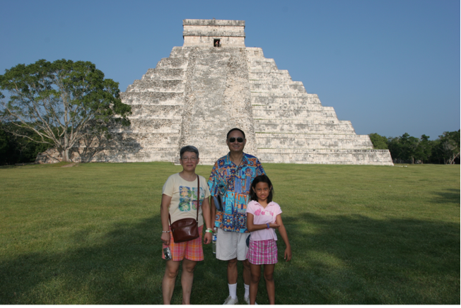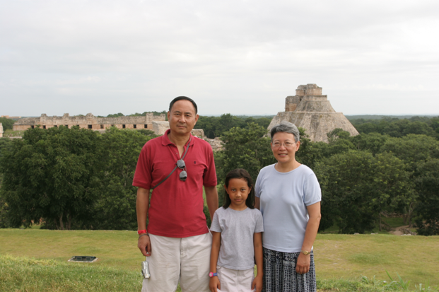 我们见别人往塔上爬,也跟随爬,爬了几级感到不行,台阶太陡没有扶手,只有一根绳子,就赶快让海弢、婷婷和彬彬都不要爬了。我和丫丫,还有梦华爬上去,24米不算高,但上去以后很害怕,顶上中间空的庙,丫丫只能站在里面,不敢走到外边来。外边其实也很宽,但没有栏杆保护。四周一片葱绿,整个建筑群一览无遗。上山容易下山难,台阶又高又陡,我们是脸朝台阶背朝天,手脚并用,一前一后,中间夹着丫丫爬下来的。婷婷因为不能上去非常生气,但显然我们这种爬台阶法给她印象颇深,以后见了台阶不论高低都是手脚并用倒爬。我们当时就奇怪为什么印第安人那么矮小,却修这么高的台阶,看书知道这是故意修成这样,使人不能背对上帝拾级而下。