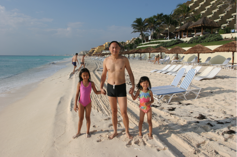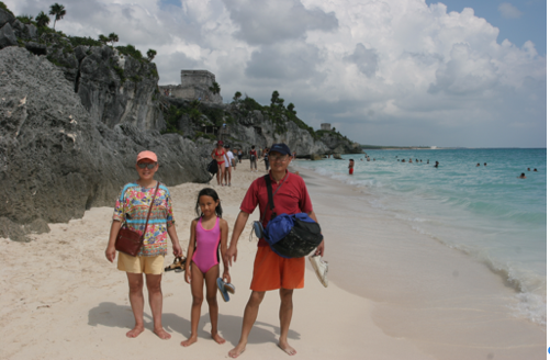 第五天一早去图伦(Tulum),这是早年印第安人,已经不是马雅人了,可能是中美洲人在海边修建的雕堡,既可用于祭祀,也可用于防御。塔已经看不出原貌了, 但建在黑色的岩石上,岩石下就是海水,很有气魄。这个景点离坎昆很近,一早大汽车载着成群的旅客蜂拥而至,而且人家是有备而来,身着泳装,披条大毛巾。沙滩上人很多,但孩子们玩得很高兴,因为海水浅,没有浪,让回来时都不肯出水,上了岸以后都走不动路了。上车以后就下雨,对我们一路天公作美,没有一次让我们淋雨,总是在我们进车进屋以后才下雨,而且雨的时间也不长。当晚我们就在房间里拼起桌子会餐了。