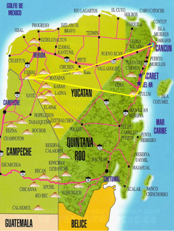 尤可坦半岛(Yucatan)从地图上看就像是墨西哥伸向加勒比海(Caribbean)的大拇指。半岛的北部是墨西哥湾,南部是加勒比海,坎昆(Cancun)就在大拇指的指甲尖上。古巴革命以前,哈瓦那是北美人在加勒比海的乐园,革命以后古巴不能去了,墨西哥湾沿海一带的渔村就发达起来了,再加上半岛上开发的马雅文化遗址,坎昆就成了北美人在加勒比海上的新乐园,一年到头都是旺季,只有八至十月是台风季节,人稍微少点,我们才能订到机票,旅馆也相对便宜。