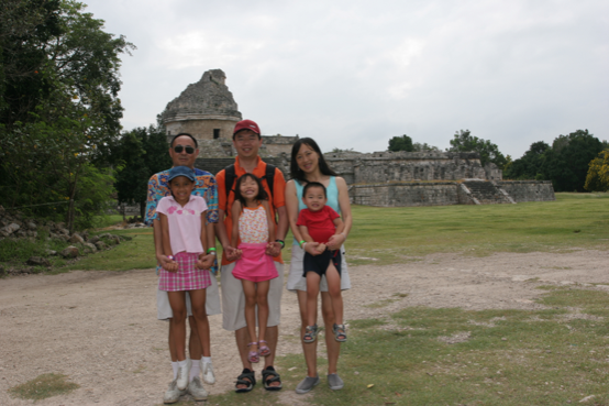 第二天一早,我们又是赶在开门以前就等在门口,这样照相环境好,偌大的庭院,我们转着圈照相,只有我们一家人。乌克斯穆的建筑比车臣义扎早200年,占地面积相对小,比较集中,更具有马雅建筑的代表性。一进门也是一座金字塔,但塔底是椭圆形,一直到顶都是圆的。乌克斯穆(Uxmal)的意思是“建了三次”,塔的结构可分五个组成部分,其中一个庙门口像一张大嘴,是典型的马雅人崇拜豹子头,到处都可以看到。现在塔的台阶都不可以爬了。