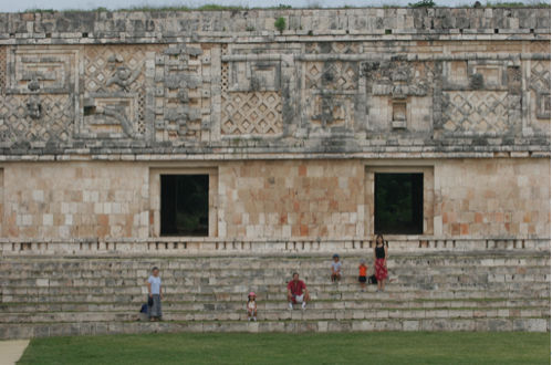 塔的旁边是一个长方形的大庭院,象个巨大的四合院,每边都是一排房子,房子的墙壁雕花刻字,是马雅人传说的神话故事。四边房子共88间,不知是不是“发发”的意思。每边台阶的高低还不一样,可能是那时国家公务员的办公室。出了大院,走过足球场,是首领的宫殿。 100米长的大房子座落在7米高的台阶上,房子是用石头砌起来的。那时不会造房顶,房顶是每块石头斜一点最后封顶,所以屋顶很大。有趣的是屋顶角上也有象中国宫殿那样的石兽、或是龟、或是鸟,一串排下来。我们觉得没有白跑这么多路来乌克斯穆一趟。书上说像类似的建筑附近还有许多,说明在公元700-900年间这一带马雅人口众多,但不能肯定已经形成了国家和城市,有部落首领,但不能肯定他是国王,后来为什么这些建筑被抛弃在丛林中,人为什么离开,离开了以后又去什么地方,仍然是个谜。