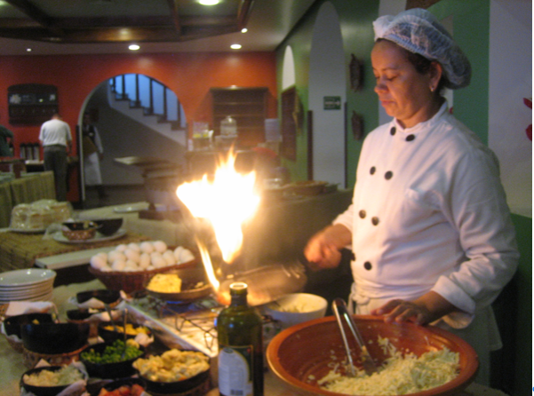 当晚的晚餐是在旅馆里吃传统巴西烧烤,三十多美元一个人,但和经理说好丫丫不收费。晚上吃饭的时候上百人的餐厅都坐满了,有很多日本游客,日本寿司做得很好。最好吃的是烤鱼,鱼大得像半片猪肉,包着锡纸在火上烤,肉里有厚厚的鱼油,又嫩又鲜,从来没吃过这么美味的鱼,边吃边后悔先进嘴的那些牛排和猪排,把胃给占满了。丫丫不停地给烤肉师傅照相,师傅让她进去,戴上厨师帽,给人切肉。