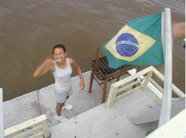 终于九点半来人接,十点上了船,去看清水河和黑水河交汇的地方。我们航行的河就是黑水河,水的颜色象未加奶的黑咖啡。河面有两三公里宽,现在是低水期,要是高水位时大概就象海一样望不到边了。水道中间就有加油站。往下游走了有一小时河面更宽了,河岸有一座大型化工厂,烟囱冒着浓浓的黑烟,往我们地球的肺里放毒,看着很不舒服。正在大家被赤道的太阳蒸得昏昏欲睡的时候,船长告诉我们到了。低头一看,所谓清水河,就象加了奶的咖啡,从另一边缓缓而来,黑咖啡和白咖啡并列,井水不犯河水成为亚马逊河,向东流去。丫丫拿出准备好的牙刷,在船舷照相,因为她的牙医要大家暑假的照片,有奖投稿,虽然风景一般,但这是亚马逊河。斐然西斯刚从睡梦中醒来看见这混浊的河水,上面还有斑斑点点的柴油,大失所望说“就这个?”(That is it?)