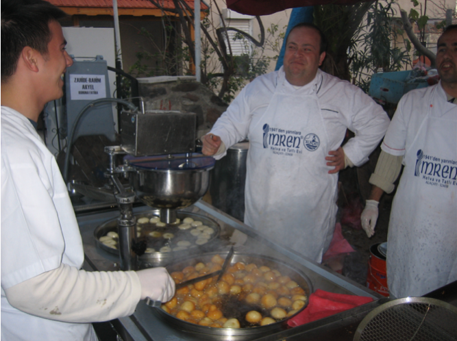我们的所在地切什梅(Cesme)是爱琴海的一个半岛,它位于土耳其的西部,伸入地中海,是愛琴海海岸特別美的地区。长长的海岸线上,有着许许多多橄榄树果园、峻峭的山岩,以及被松林拥抱着广阔而素雅的海滩。我们的旅馆所在地厄乐佳(Ilica)是度假中心,有非常不错的白沙滩,湛蓝的海水清澈见底。这里是富人和欧洲人夏季避暑胜地,为这些人专门修建了六条线的高速公路。街道干净整齐,红瓦白墙的别墅错落有致,但都是空的。我们去集市逛,不是旺季,集市上都是当地人,卖的蔬菜新鲜,使我有北京早市的感觉。忽然看见有人捧着一盒奶油炸糕,我和陆彬同时叫起来,从北京来的都记得东安市场吃奶油炸糕的情景。我们立刻挤上去排队。结果还不要钱,白吃,味道和北京的一样,没有撒糖粉,用糖水粘,吃得两个小家伙也连连叫好。在北京吃奶油炸糕排队抢座大概是半个世纪以前的事了,没想到在土耳其又吃到了。