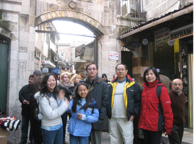 我们这次是两家同行,不同的航班,几乎是同时离开,同时到达伊斯坦布尔机场,然后租一辆十人座的大车进城找旅馆。旅馆离市中心不远,地图上标得很清楚,但街道上的路标不清楚,在高速公路上行驶,错过一个路口很难回头,一直开下去是座大桥,我们以为是横跨欧亚大陆的桥,(后来知道这是横跨金喇叭河的桥,还在欧洲)心想这么容易就从欧洲到亚洲了。顺原路回去找到了大街又迷失了小巷,最后住进旅馆时,我们已经围伊斯坦布尔老城转了三圈了。