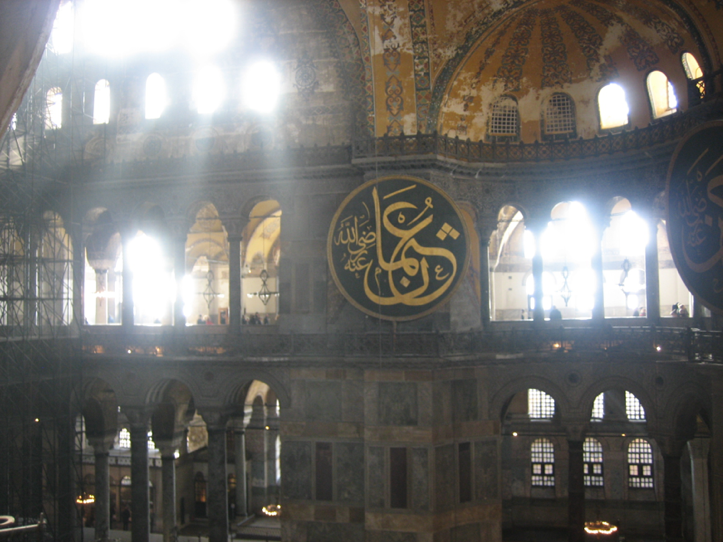 街对面的阿亚索非亚(Haghia Sopia)清真寺要比蓝清真寺老一千多年。建于公元三百年拜占庭(Byzantine)鼎盛时期。拜占庭是从罗马帝国分裂出来的基督教国家,伊斯坦布尔原名康士坦丁堡(Constantinople)就是以拜占庭国王康斯坦丁(Constantine)命名的。拜占庭以康士坦丁堡为首都统治了一千多年。在这一千多年里,阿亚索非亚是基督教堂,一直到1452年被伊斯兰教的奥特曼帝国占领了康士坦丁堡,把基督教堂改成清真寺。阿亚索非亚作为博物馆是历史的见证人,外表上看它有清真寺的圆顶和尖塔,内庭屋顶和墙壁里壁画上可以看到很多拜占庭时期基督,圣母的画。一方面是那些画水平高,是用石子一粒一粒粘上去,另一方面后人没有把它销毁,只是覆盖,说明那时不同宗教的容忍程度还可以。