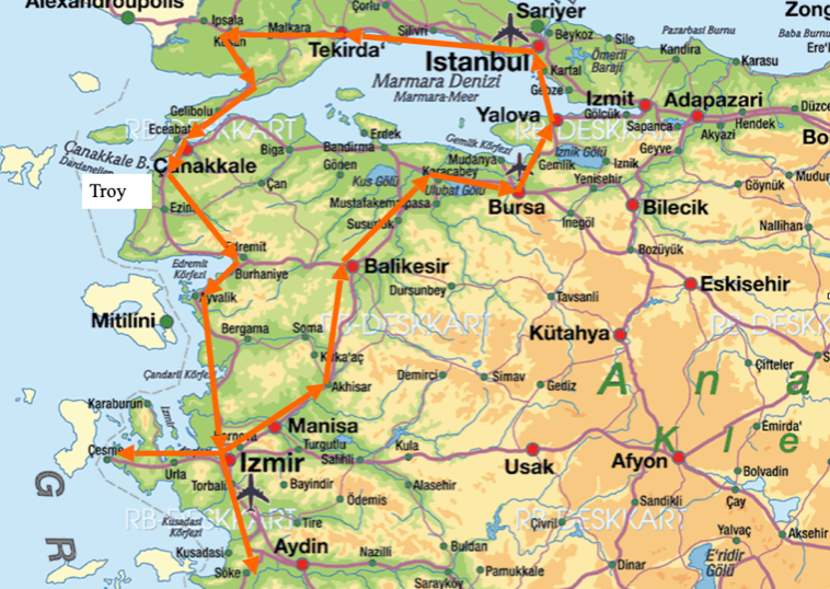 第三天我们要长途跋涉七百多公里去西部沿海的土耳其第三大城市伊兹密尔,从伊斯坦布尔出发向西走到底,然后乘渡轮过达达尼尔海峡(Dardanelles),估计开八个小时车晚上可以到。但我们低估了形势,开上渡轮已是下午三点钟,还有四百多公里的路。这是一条远路,其实在城里就有渡轮直接过海,我们是想来回走不同的路,非要到这天涯海角来。渡轮每小时一班,半个时辰就从欧洲到亚洲了。亚洲的海角城市是恰那卡莱,在城南五十公里的地方叫特洛伊(Troy)以其4000多年的历史成为世界上最著名的考古遗址之一。