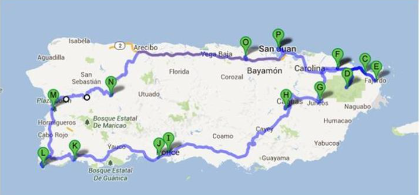 J:El Tuque,K:La Parguera, L:Bahia Salinas, M:Mayaguez, N:Lares, O: Dorado