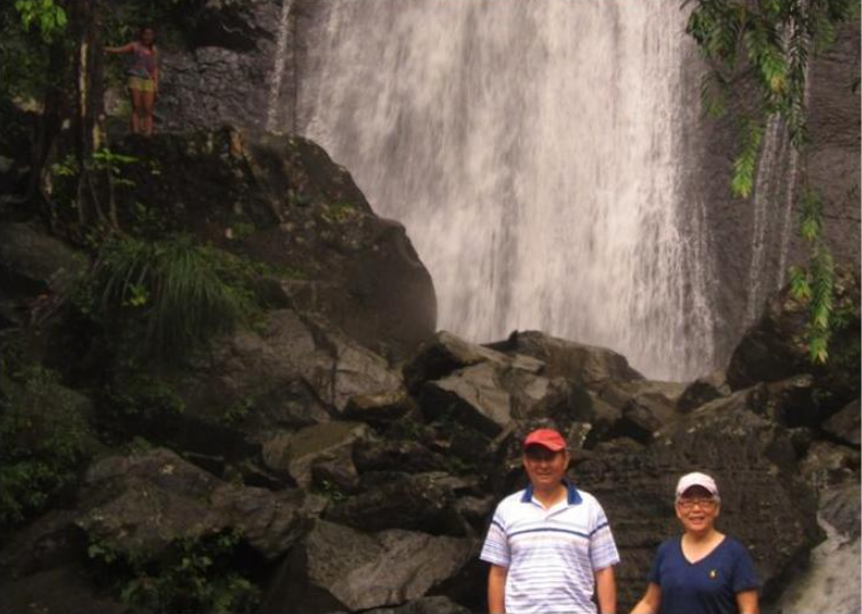 丫丫选了一条三英里长的小路,她一个人走在前面,我们两个在后面走走停停。小路修得很好,隔不远就有一座凉亭供人休息。后来体会到不仅是休息,更是为了让人避雨。隔几分钟就会下一场瓢泼大雨,我们打着折叠伞根本没有用,有经验的人身穿雨衣,会玩的人干脆光膀子或穿游泳衣,在雨中照样行走。后来我们也不在乎了,在热带雨林里行走哪有不湿的道理。沿途到处都是的小瀑布,小瀑布汇和成大瀑布。有的瀑布底下可以游泳,丫丫犹豫了一下还是没下水,因为雨后的瀑布水很浑浊,不知深浅。森林中有一座瞭望塔,爬上去可以在高处欣赏这一望无际的绿色林海,还可以看到曲折的海岸线和遮掩在云雾中的群山。